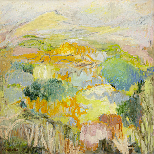 “As an outdoor enthusiast, I am not only inspired by what I see but by what I feel when immersed in the wilder side of nature,” she explains. “This series is based on my trips to the Grampians National Park (Gariwerd) in Victoria. In the foreground is an abstracted depiction of what the bush is made of — a tangle of vegetation, deadwood, rock formations, trails, seasonal light, and cast shadow. I want a sense of distance to convey the vastness of this country, while my colour choices capture the mood of the day. I work in the studio from a portfolio of my photographs and impressions sketched on location.”